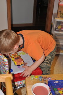For some reason LAD is fascinated with painting his cars, trains, whatever will hold still long enough. Guess I'm not the only one who likes to have painty hands! By the end of the session, each little pain pot was a nice shade of BROWN. He would start at the first pot and dip in each one till the end, then paint the car.